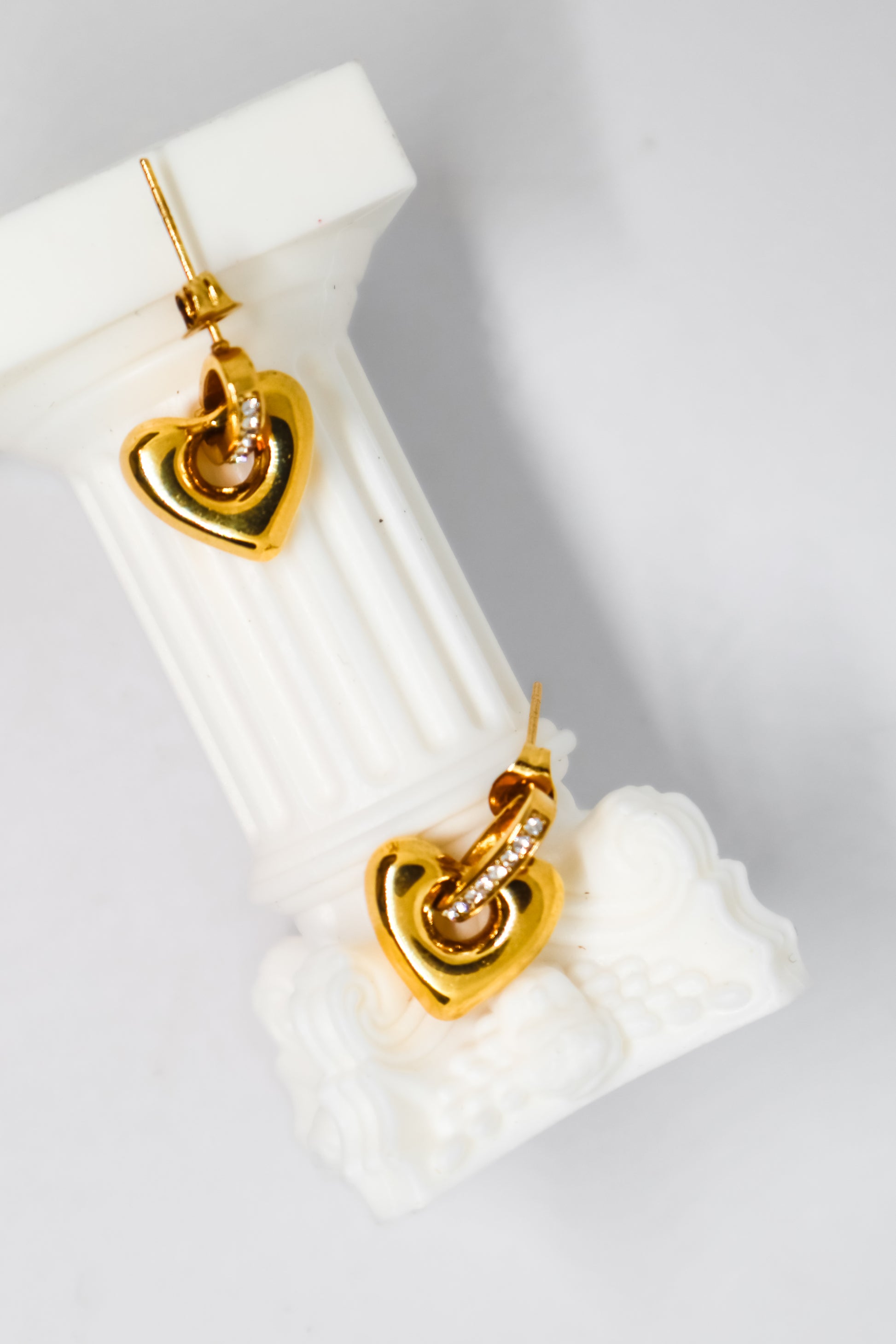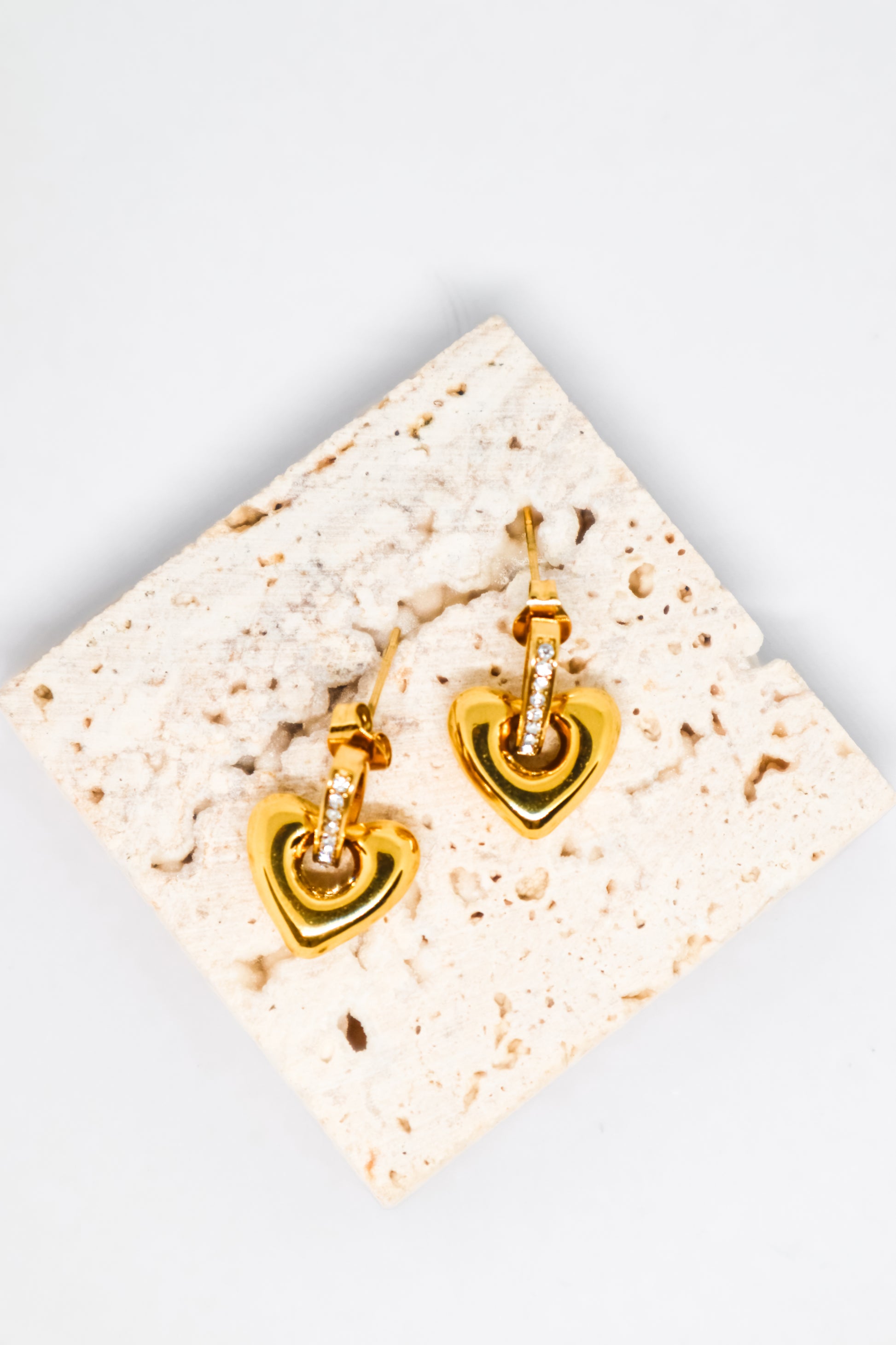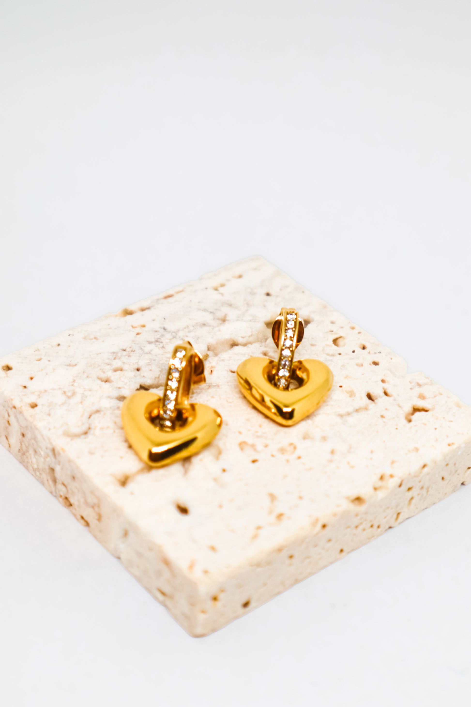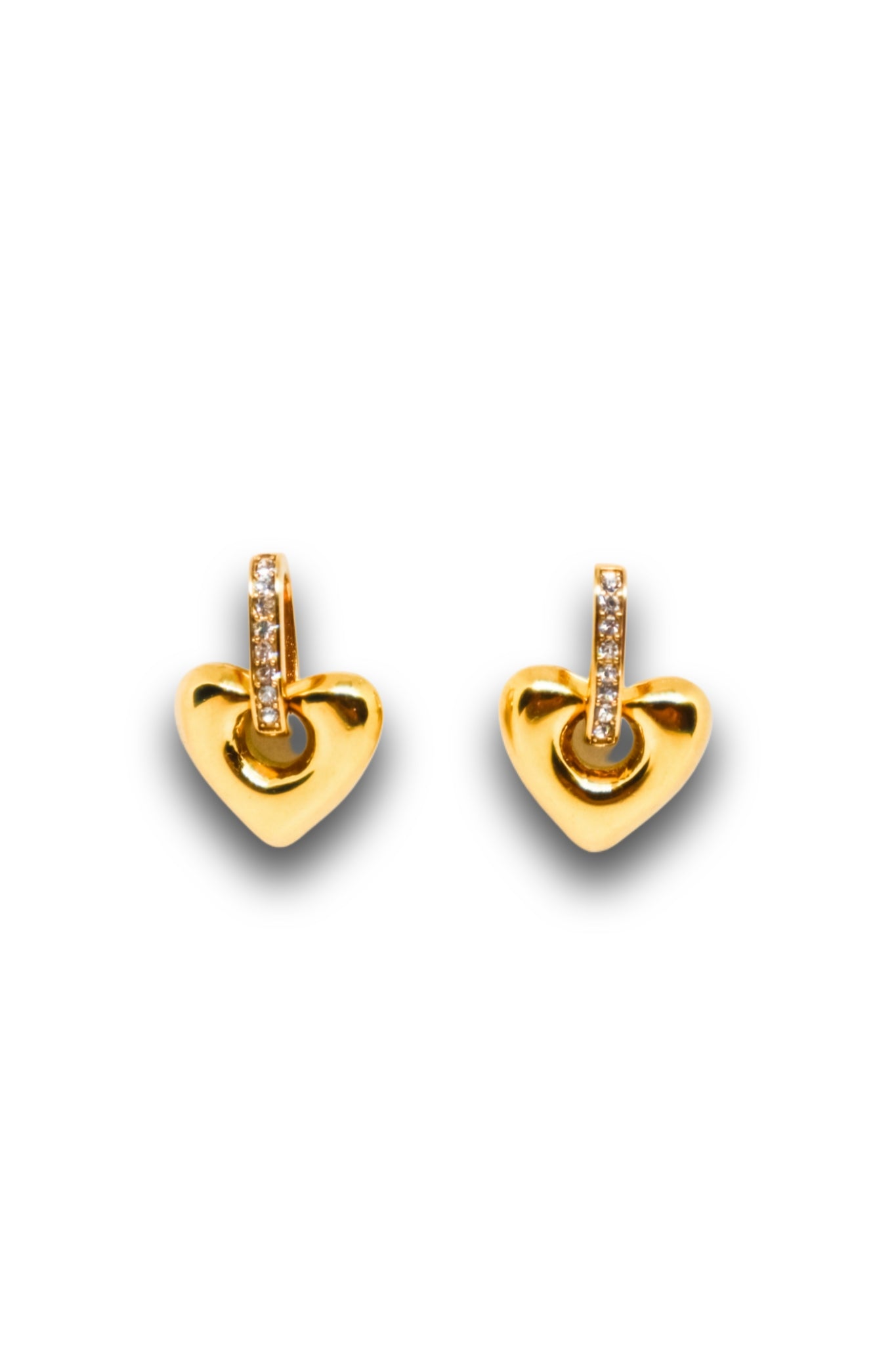 Brincos de coração dourado com aro cravejado com zircónias — brilho romântico e acabamento sofisticado.