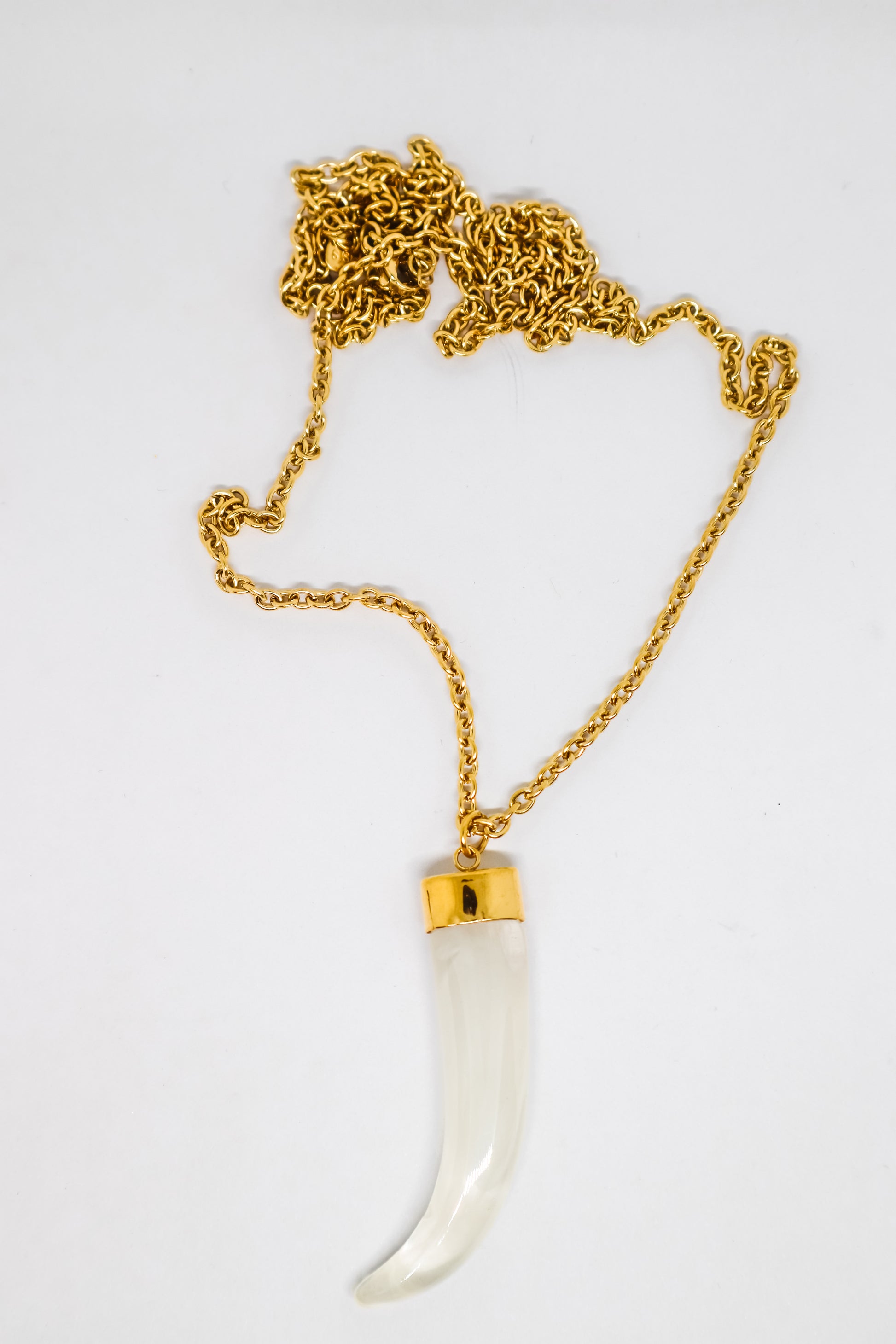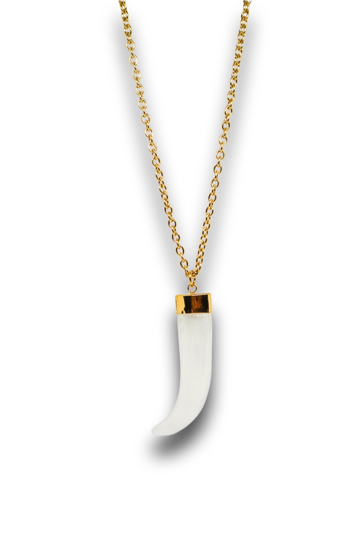 Colar longo com pingente de chifre — símbolo de força e estilo com contraste marcante entre branco e dourado.