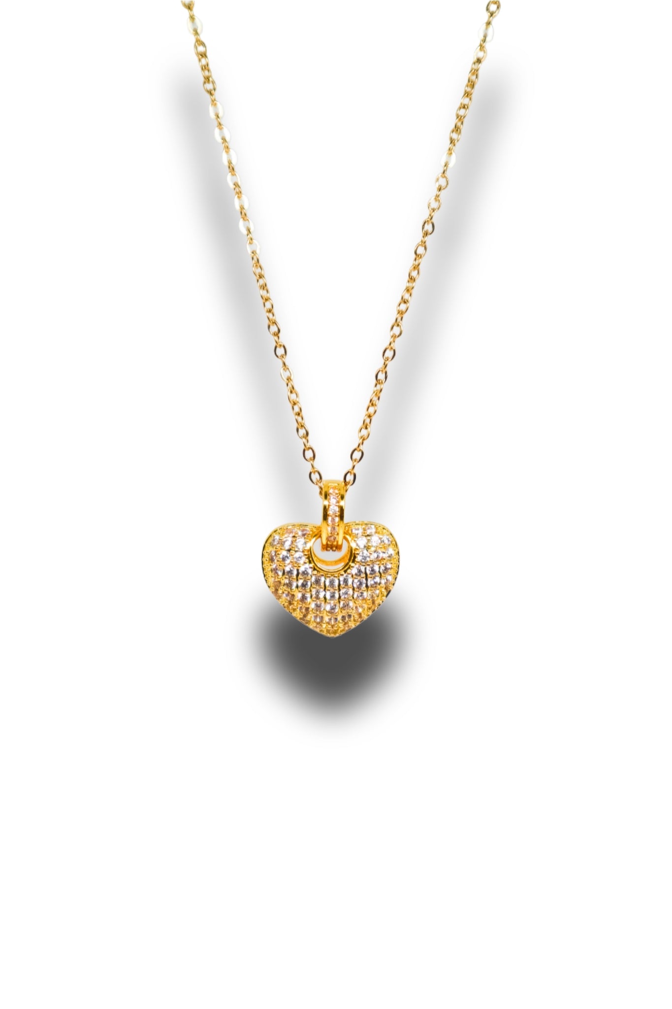 Colar dourado com pendente em coração cravejado, brilho romântico e design intemporal .